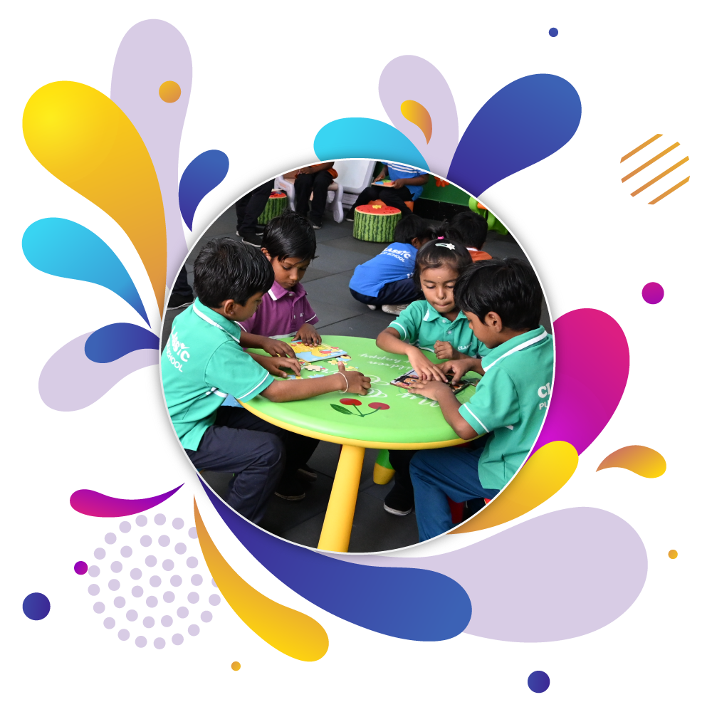 • The school offers a variety of co-curricular activities to help students develop their talents and skills. Qualified teachers guide students in carnatic singing, dance, drawing, art & craft and theatre. A special Learning Theatre is set up where students practice and perform class-wise shows. Pre-KG to Grade 8 students regularly take part in these stage activities.